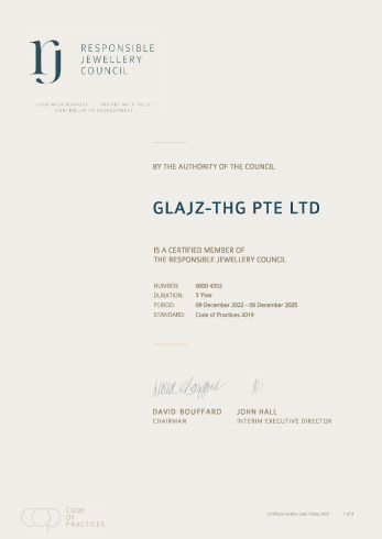 As a certified member of Responsible Jewellery Council (RJC), a non-for-profit organisation that has been established to promote responsible ethical, social and environmental practices, which respect human rights, throughout the Diamond, Gold and Platinum Group Metals Jewellery supply chain, GLAJZ operates our business according to the Code of Practices.
